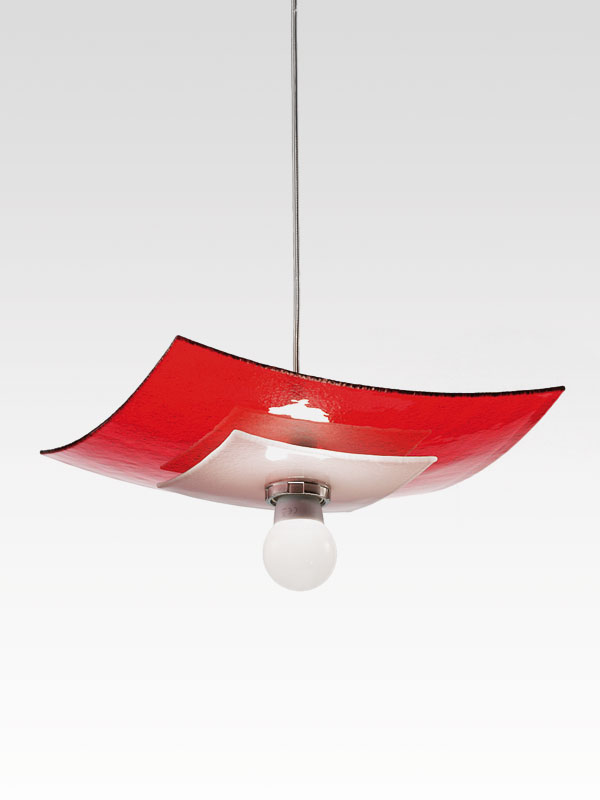 Lampada a sospensione 1 luce composta da un vetro colorato e da un vetro neutro. I vetri 30x30 cm, sono disponibili nei colori cristallo, rosso, arancio e ambra. I vetri 16x16 cm, sono disponibili nei colori: rosso, ambra, blu, viola, cristallo, arancio, nero, fucsia, oro e argento.